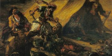 Më 1832, Delacroix i rikthehet sërrish ngjarjeve në Ballkan, revolucionit grek dhe luftrave greko-turke. Një seri tablosh janë të lidhura me figurën e Xhahur Pashës. Kuajt e Delacroix-së padyshim janë kuajt më ekspresivë në botën e pikturës klasike. Në “Greqia jep shpirt mbi rrënojat e Mesalongjit”, duket një vajzë e re mbi gërmadha në një atmosferë të zymtë, pas beteje, me gjoks të hapur dhe një vështrim plot dhembje. Kjo tablo është padyshim pararendëse e asaj tabloje që ai do të krijojë më vonë me deçiturën “Liria ose Liria prin popullin”, (La liberté guidant le Peuple). Delacroix ishte një humanist që i përkrahu popujt që kërkonin të fitonin lirinë.