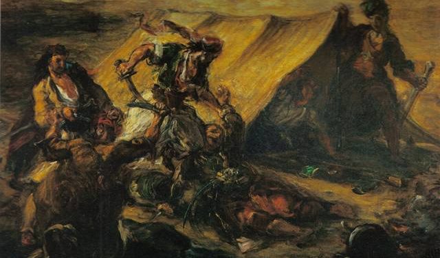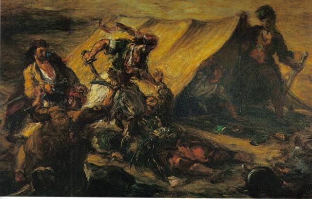 Për Baudelaire, Delacroix ishte tipi i piktorit poet, një artist me një frymëmarrje e fuqi të jashtëzakonshme krijuese, i cili realizoi jo vetëm tablo të panumurta e vepra të përkryera të epokës së tij, por edhe shumë afreske të pallatit mbretëror, në Sallonin e Mbretit, Dhomën e Deputetëve, etj. Për Sallonin e Pikturës të vitit 1824 që do të hapej në Paris, Delacroix mendoi fillimisht për tablonë që kishte nisur para ca kohësh, të titulluar “Boçari në sulm”, por në Maj 1823 ai hezitoi ta prezantonte atë dhe iu përvesh një pune tjetër: përgatitjes së tablosë “Masakra e Scios”, kushtuar Bajronit të madh që kishte vdekur në krahët të kryengritësve heroikë. Sidoqoftë, kur shkruante për piktorin Delacroix, si një «liqen gjaku», për Baudelaire ishte ngjyra e kuqe që përdorte aq shpesh piktori dhe kur shtonte fjalët «ciel chagrin» (një qiell i hidhëruar) kishte parasysh thellësinë e sfondeve në tablotë e tij. Më 1825, kaloi në Paris konti Paliatino, një qytetar i Korfuzit dhe atëherë ishte modë që njerëz me emër të fotografoheshin dhe pozonin për portrete, veshur me kostume ekzotike, siç kishte ndodhur dhe me Byron-in, i cili ishte pikturuar me kostumin shqiptar nga Thomas Phillips. Një studiues francez thotë se Paliatino, dilte dhe në rrugët e Parisit i veshur me atë kostum suljoti. Atëherë edhe Delacroix e pëlqente shumë këtë lloj kostumi, edhe pse kur shkrimtari Alexandre Dumas organizonte ballot e tij, ai shkonte atje i veshur me një pelerinë si të Dante-s, meqë Dante-n dhe Byron-in ai i kishte idhujt të tij. Kështu, Paliatino shkoi në atelierin e Delacroix dhe pozoi për të, tablo që Delacroix donte ta paraqiste në sallonin e vitit 1827. Ishte një pikturë në vaj në dimensionet 41×33 cm, e ngjashme shumë me një akuarel që zoti Auguste, miku i tij piktor, i kishte bërë po këtij konti. Më pas, Delacroix do të vazhdonte me temën e tij orientale i frymëzuar gjithnjë nga poemat e Byron-it, veçanërisht dyluftimin e Xhahurit me Pashain në disa variante apo dhe “E fejuara e Abidos”, në disa variante, një histori tragjike, ku ati vret të birin, i cili kërkon të largohet i dashuruar me një skllave.